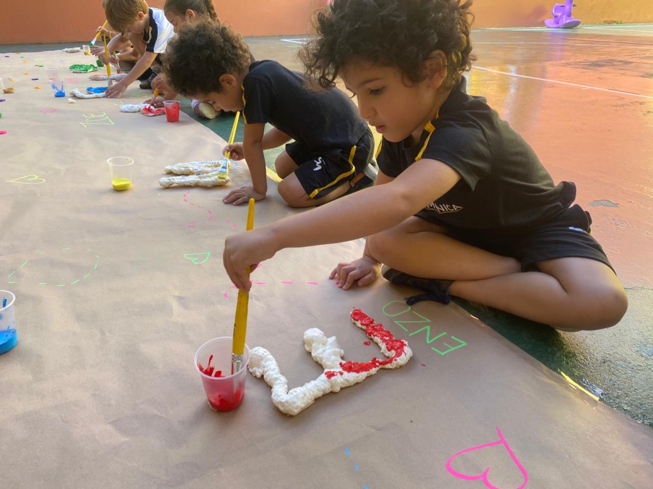 Durante a vivência, os alunos manusearam pincéis e entraram em contato com a textura macia da espuma, explorando cores, formas e movimentos. A atividade foi planejada com intencionalidade pedagógica, favorecendo o desenvolvimento da coordenação motora fina, da concentração e do controle dos gestos, além de fortalecer o reconhecimento da letra que marca o início da identidade de cada criança.
