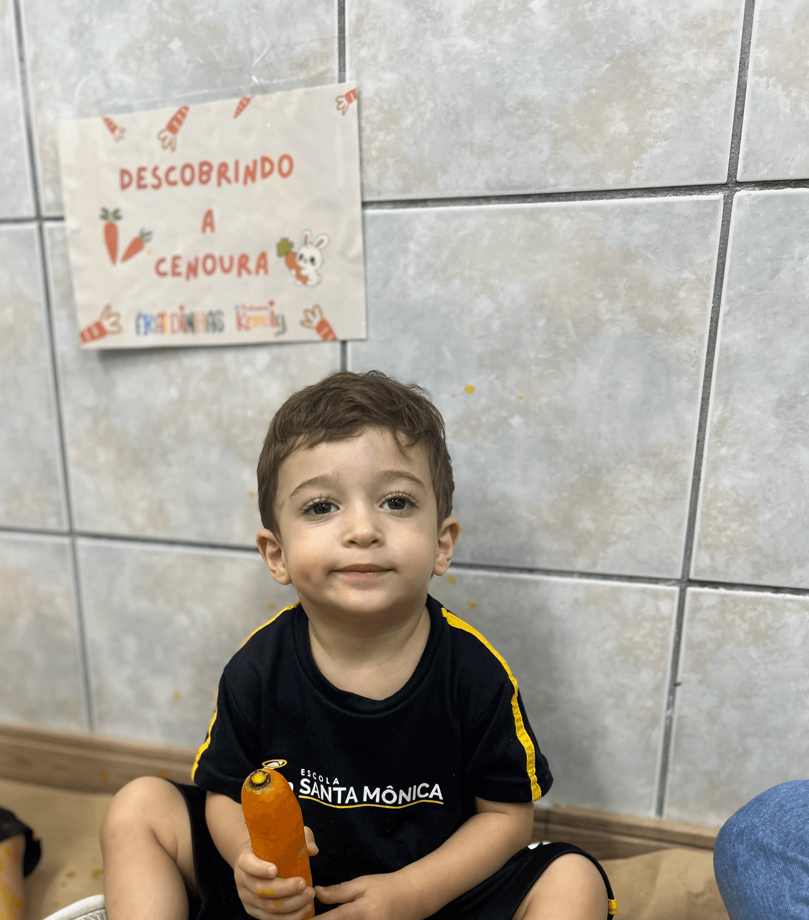 Na atividade “Descobrindo a cenoura”, os alunos tiveram contato com o alimento em diferentes formas, como inteira, ralada e líquida, percebendo texturas, cores e sabores por meio do toque, da observação e da experimentação.