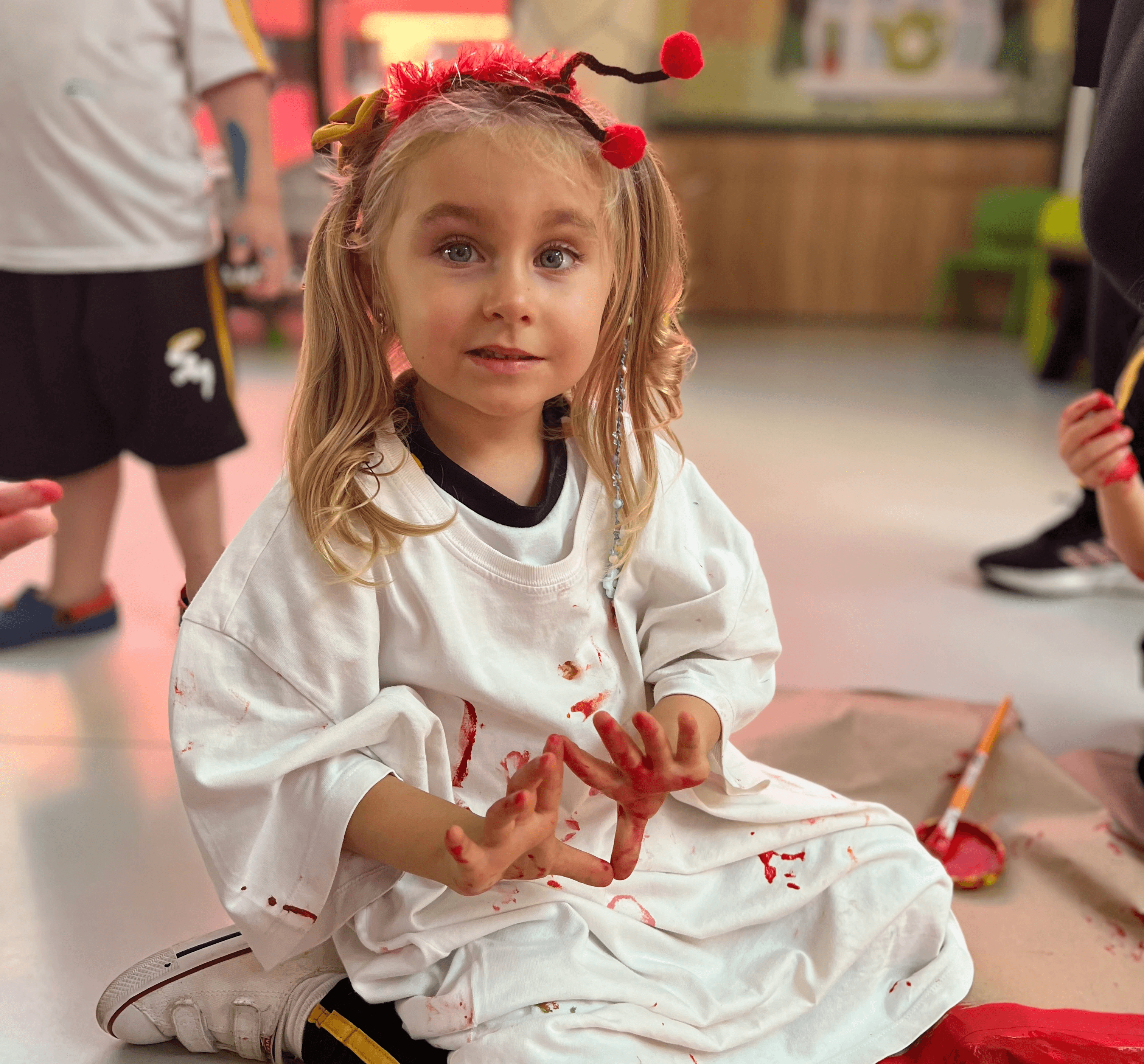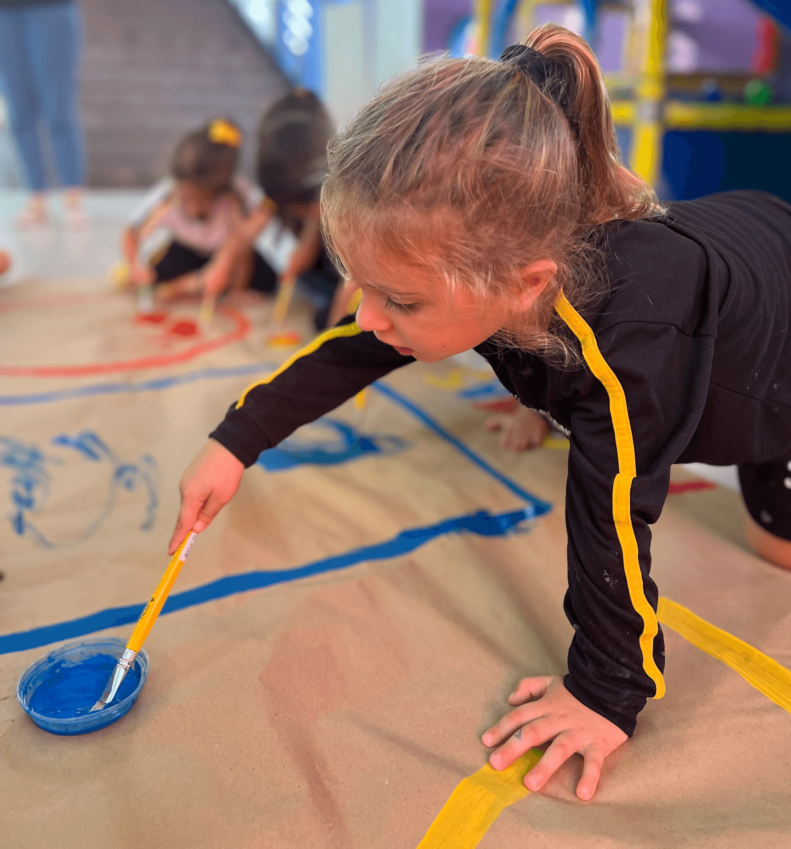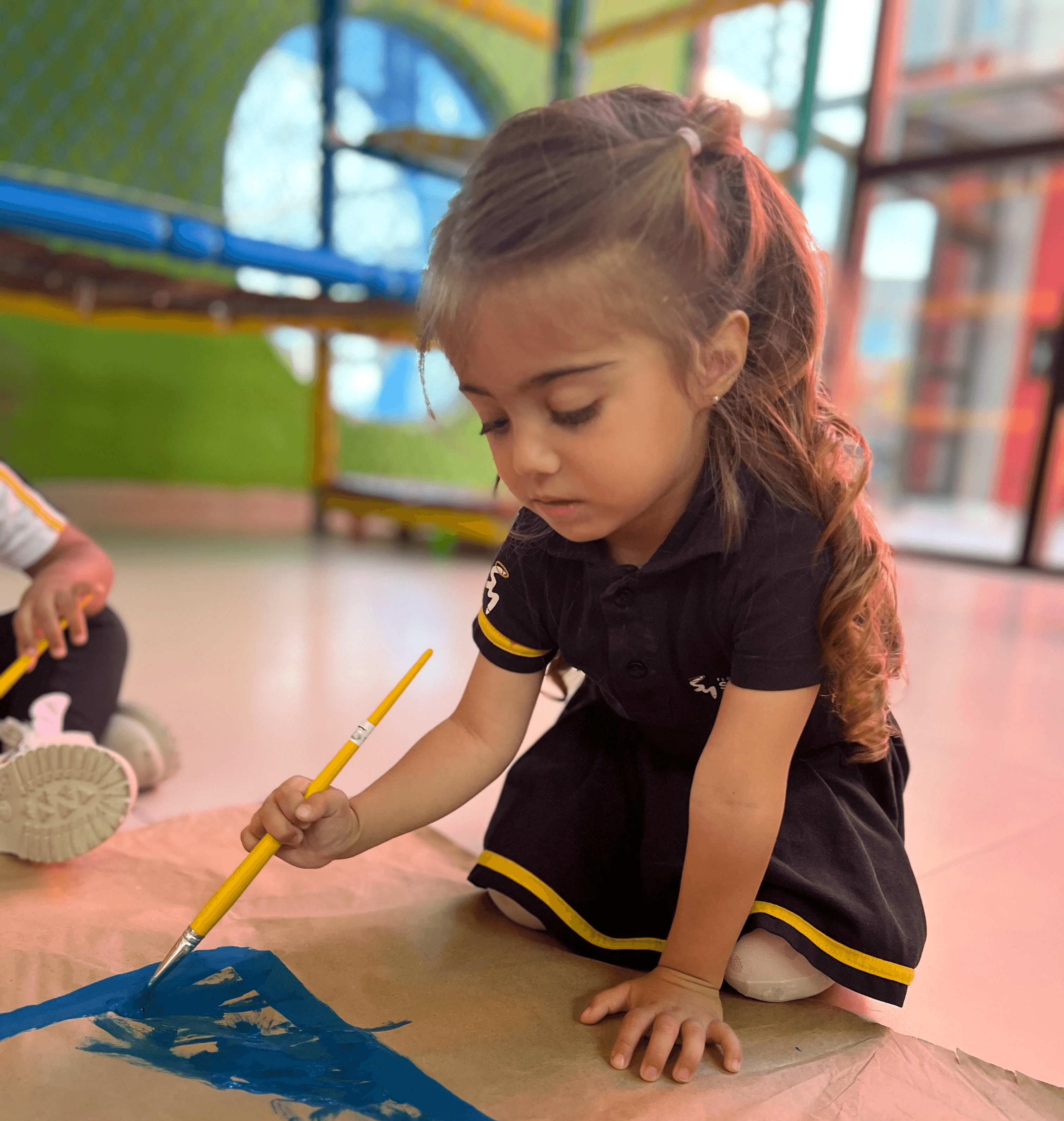Durante a vivência, as crianças exploraram as cores vermelho, amarelo e azul em pinturas realizadas com pincéis sobre formas como círculo, retângulo, triângulo e quadrado. A associação entre cada cor e cada forma favoreceu a identificação visual desses elementos e ampliou o repertório das crianças em experiências de observação, nomeação e comparação.