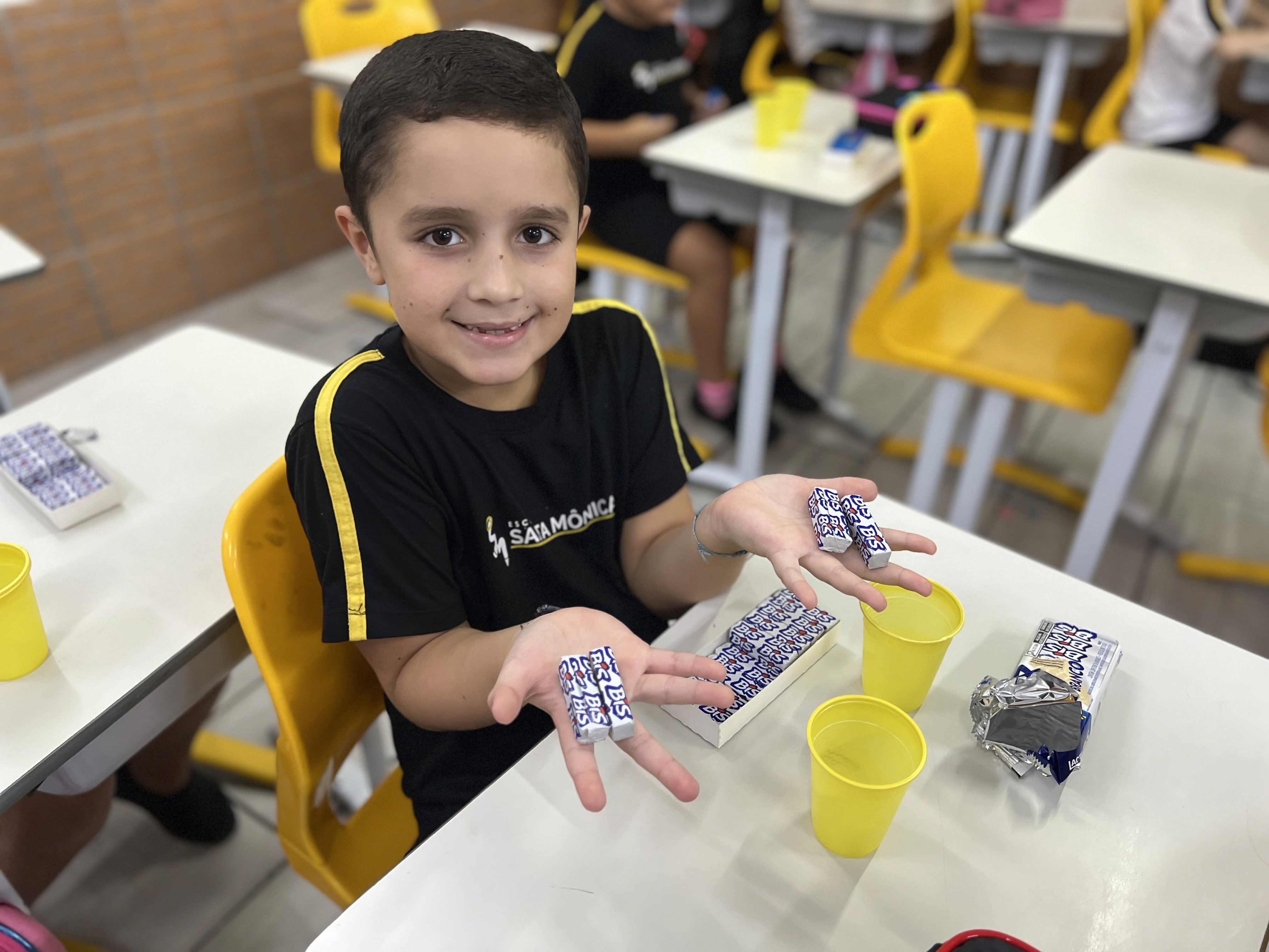 Durante a atividade, cada estudante foi convidado a repartir o chocolate com os colegas, observando quantidades, organizando partes iguais e refletindo sobre como essa divisão acontece. Esse momento favoreceu o desenvolvimento do raciocínio lógico, além da construção de estratégias para resolver situações simples de partilha.