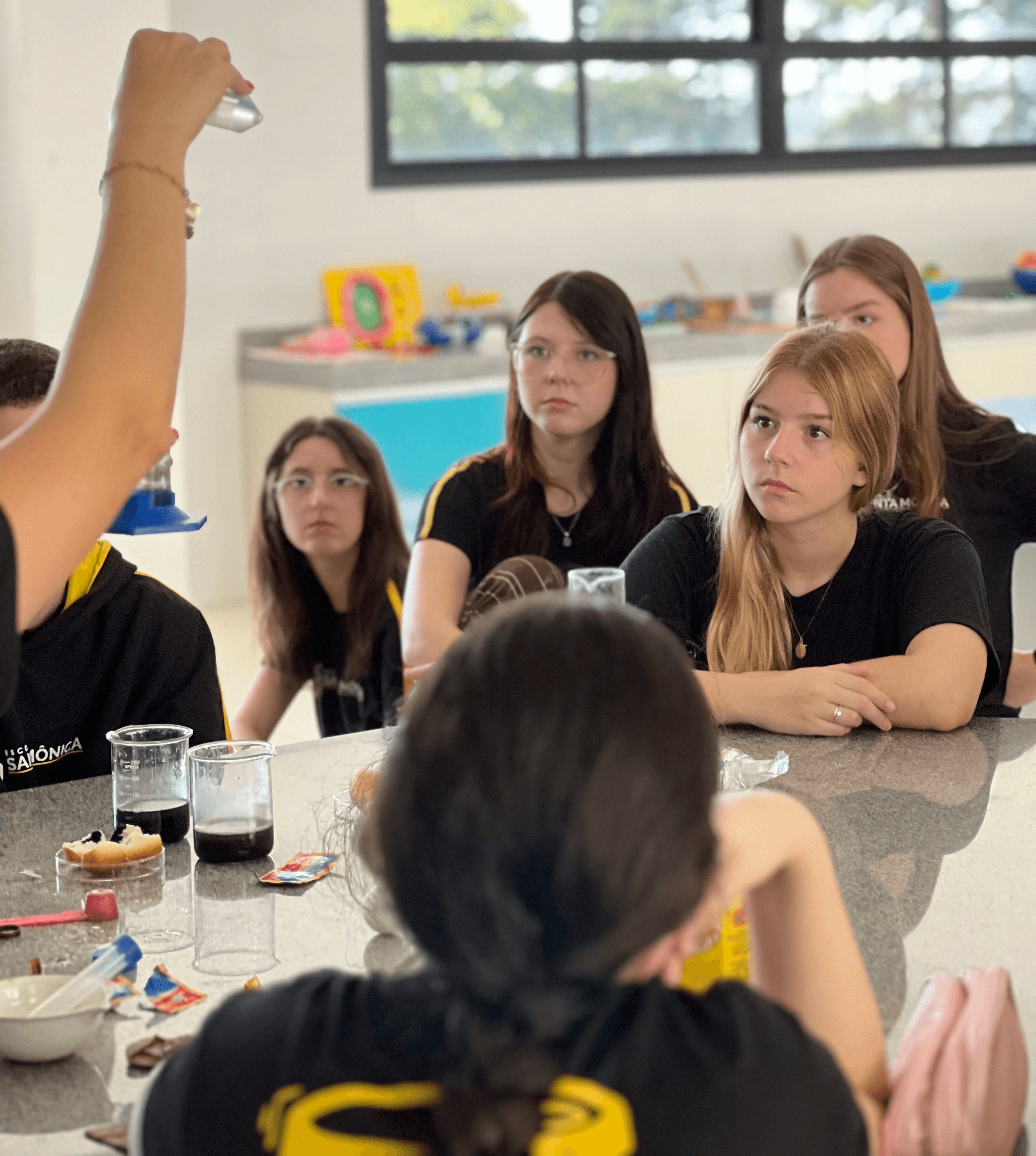 Durante a atividade, a turma teve contato com materiais e simulações que representaram etapas do processo digestivo, permitindo observar como o organismo atua na transformação dos alimentos. A partir dessas experiências, foram explorados processos fundamentais, como a mastigação e a insalivação, evidenciando a ação mecânica e química nas fases iniciais da digestão.