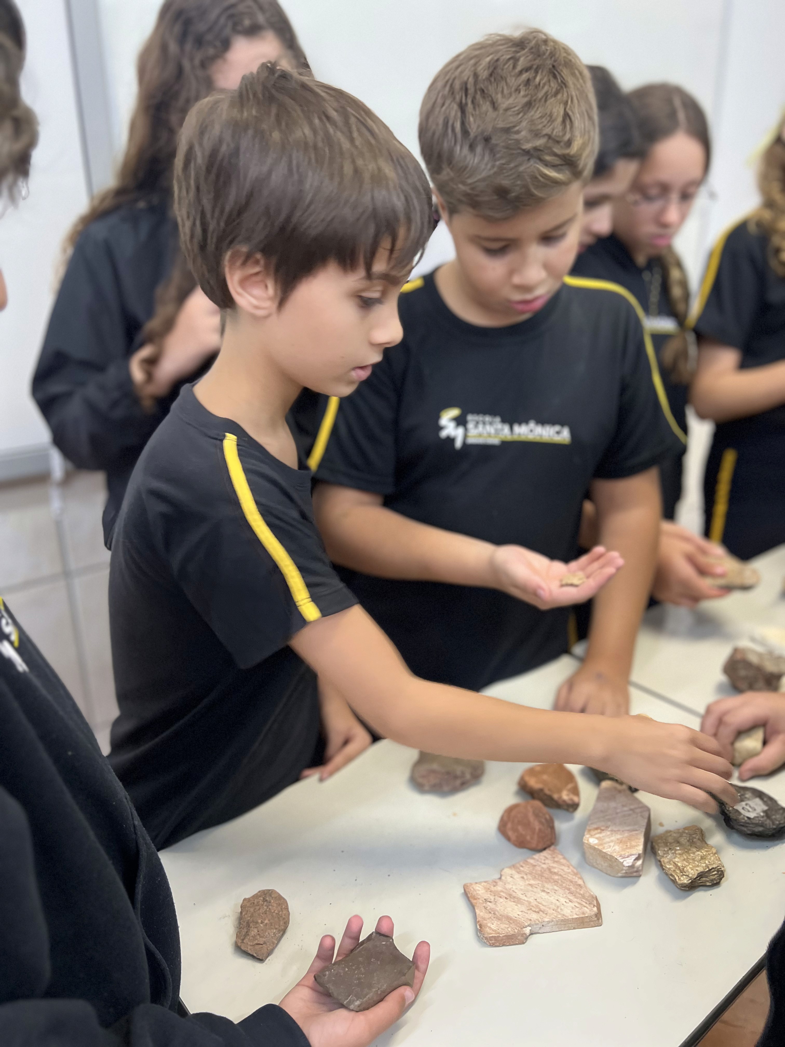 Os alunos do 6º ano da Escola Santa Mônica participaram de uma atividade voltada ao estudo das rochas e da composição da crosta terrestre, ampliando conhecimentos sobre a formação do planeta e seus materiais.