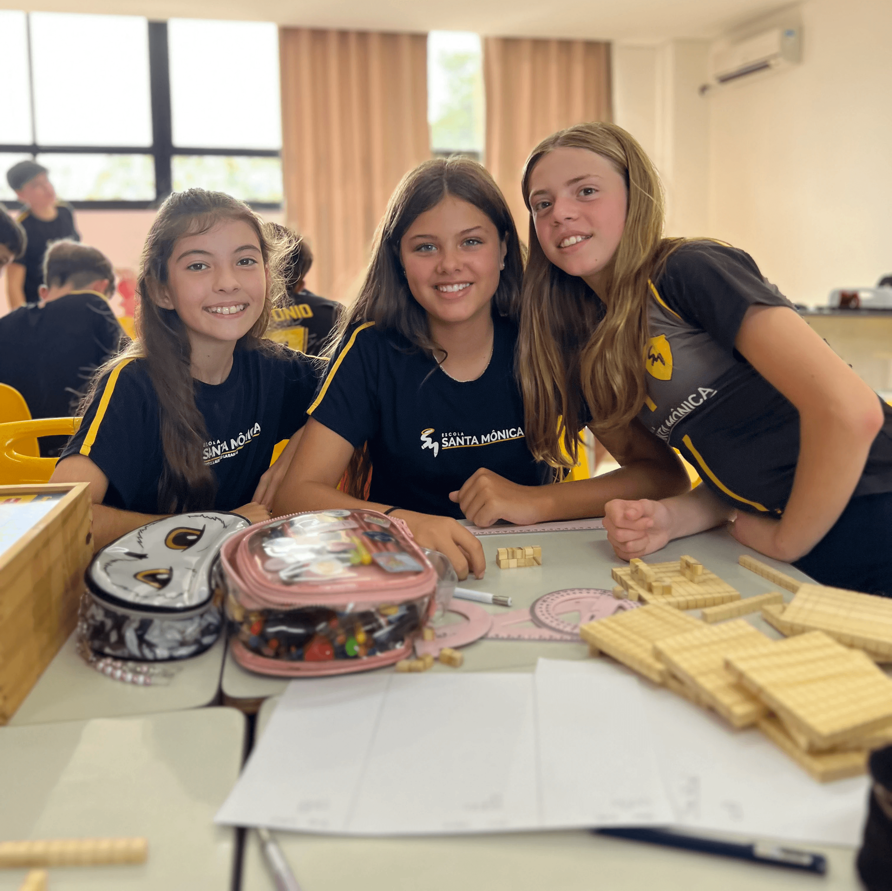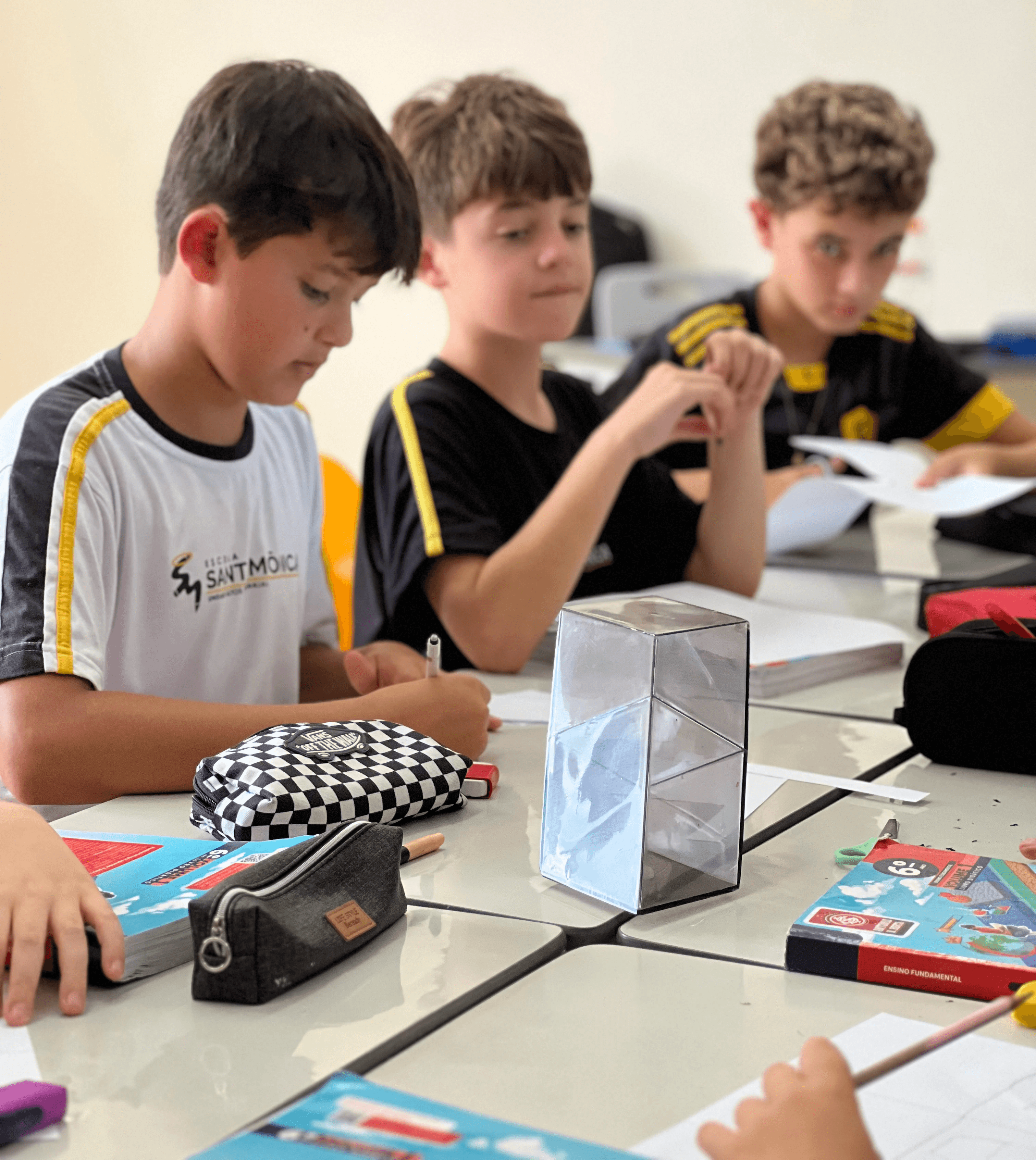 Os alunos do 6º ano do Ensino Fundamental II participaram de uma atividade de Matemática voltada à exploração de sólidos geométricos, com o uso de material dourado e sólidos geométricos transparentes de diferentes formatos. A proposta envolveu a observação, manipulação e análise de figuras como prismas e cilindros, com atenção às suas faces, arestas e vértices, além da identificação das vistas dessas estruturas.