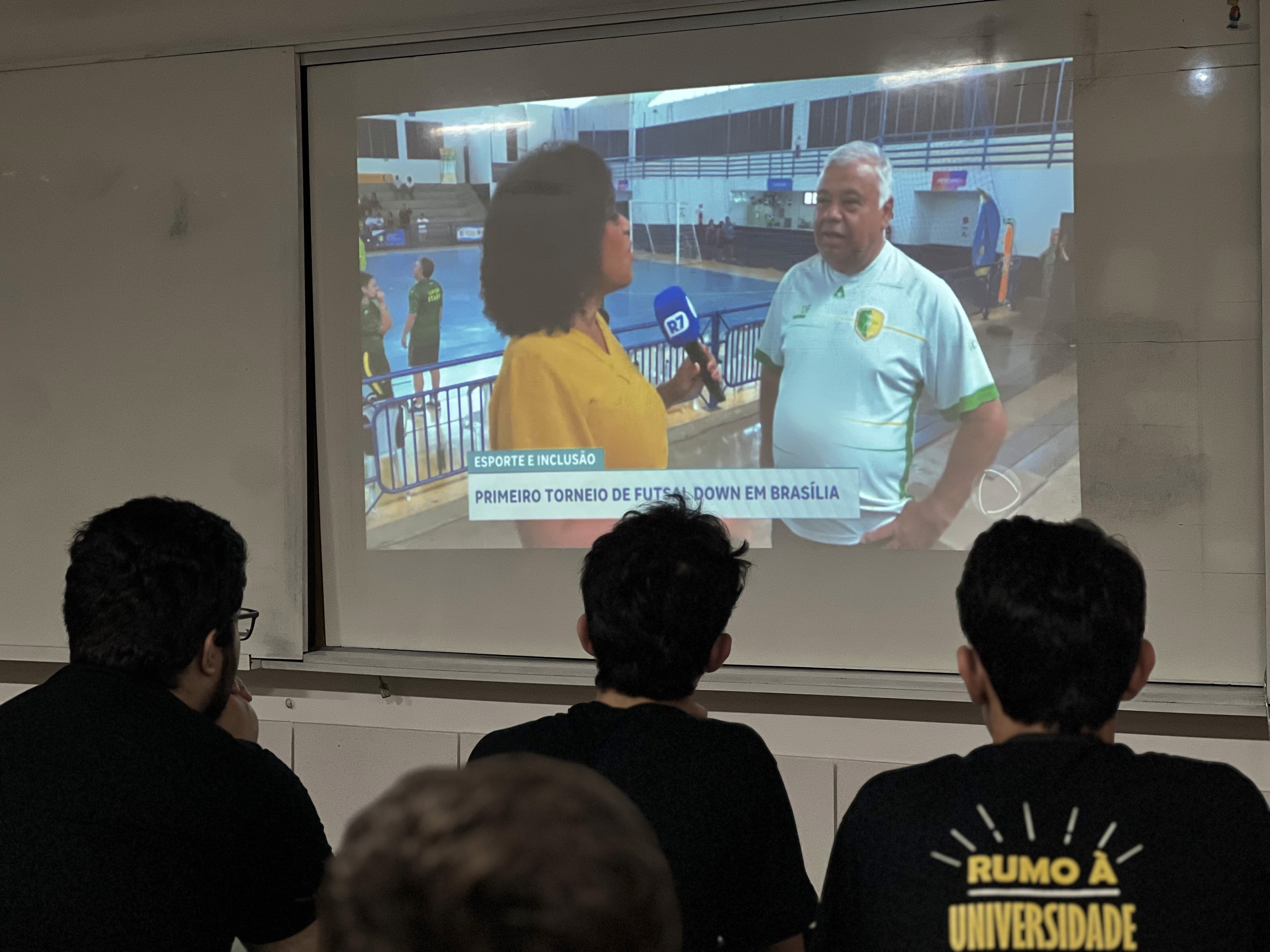 Complementando essa reflexão, na disciplina de Educação Física, os alunos participaram de um momento de apresentação sobre a inclusão de pessoas com Síndrome de Down no esporte. A atividade trouxe como exemplo um torneio de futsal, evidenciando como o esporte pode ser um espaço de participação, desenvolvimento e valorização das capacidades individuais.