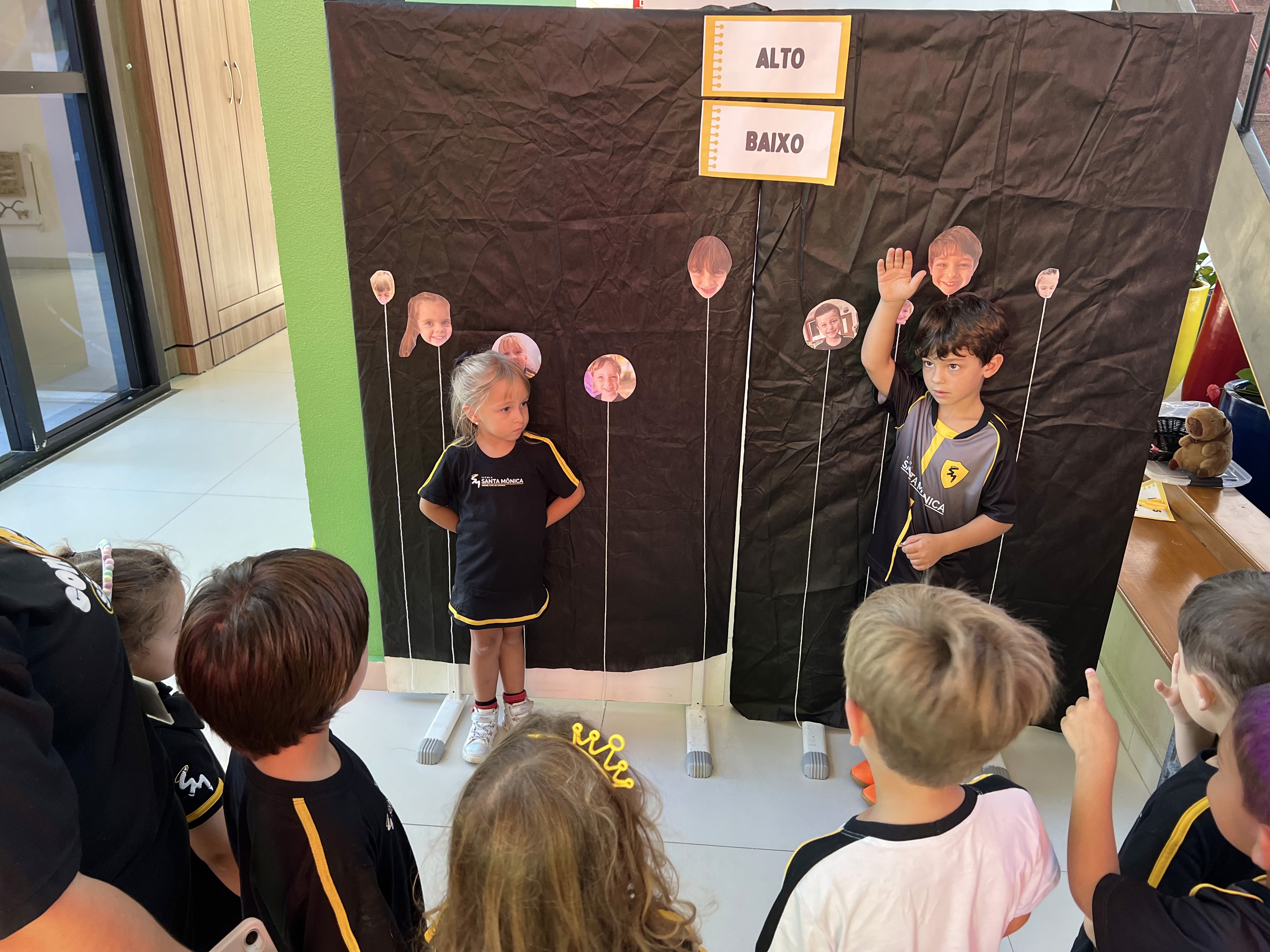 Outro momento envolveu a organização de objetos em relação às posições “em cima” e “embaixo”, utilizando duas mesas para que os alunos observassem e identificassem onde cada item deveria ser colocado. A proposta também abordou os conceitos de “alto” e “baixo”, permitindo que as crianças relacionassem essas diferenças por meio da observação das próprias medidas de altura, registradas com fotos.