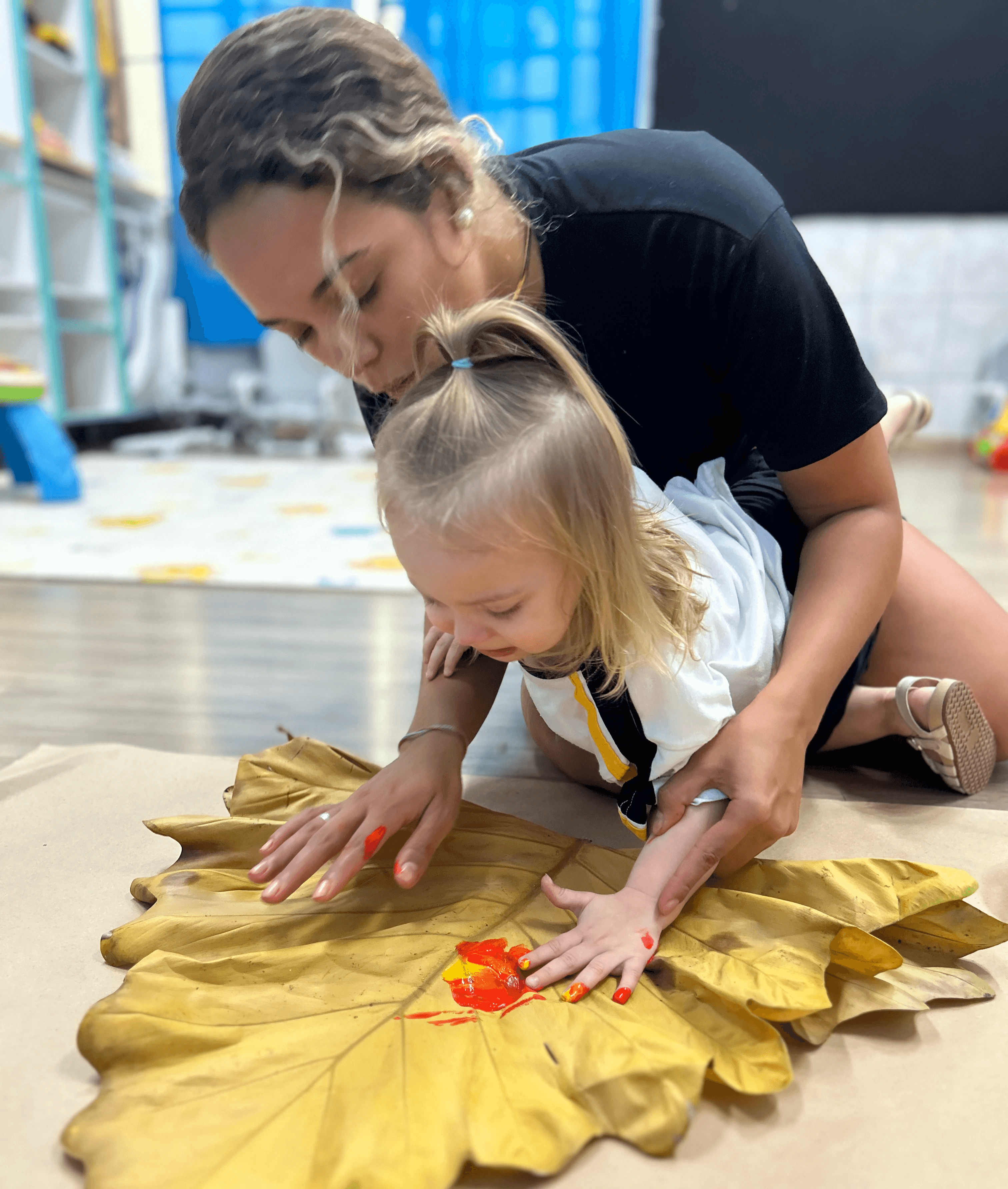 Na sequência, a turma participou de uma atividade de pintura com tinta guache, ampliando a experiência com as cores do outono e estimulando diferentes formas de expressão. O momento também favoreceu o desenvolvimento da coordenação motora, à medida que as crianças manipulavam os materiais e experimentavam movimentos variados.