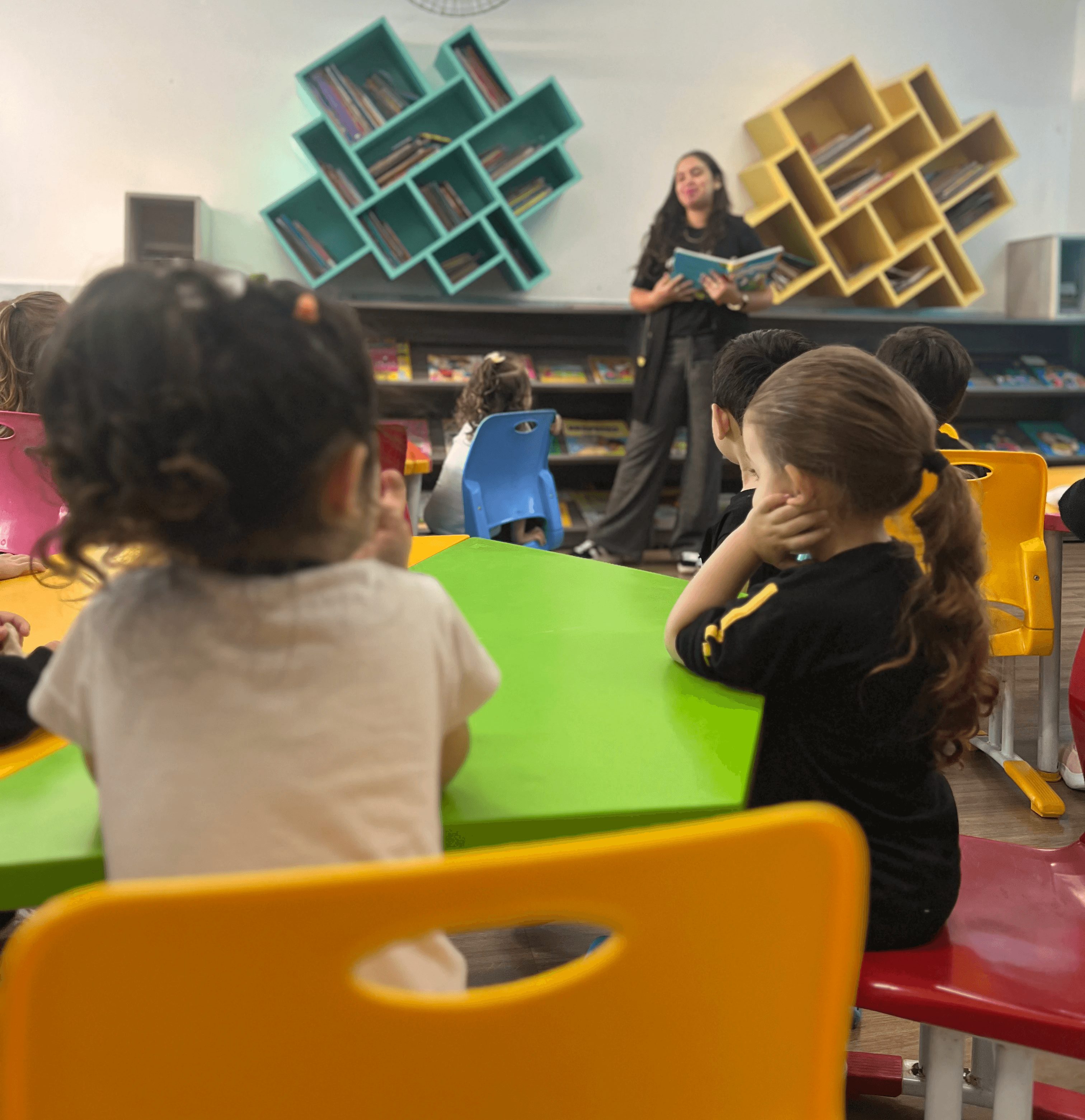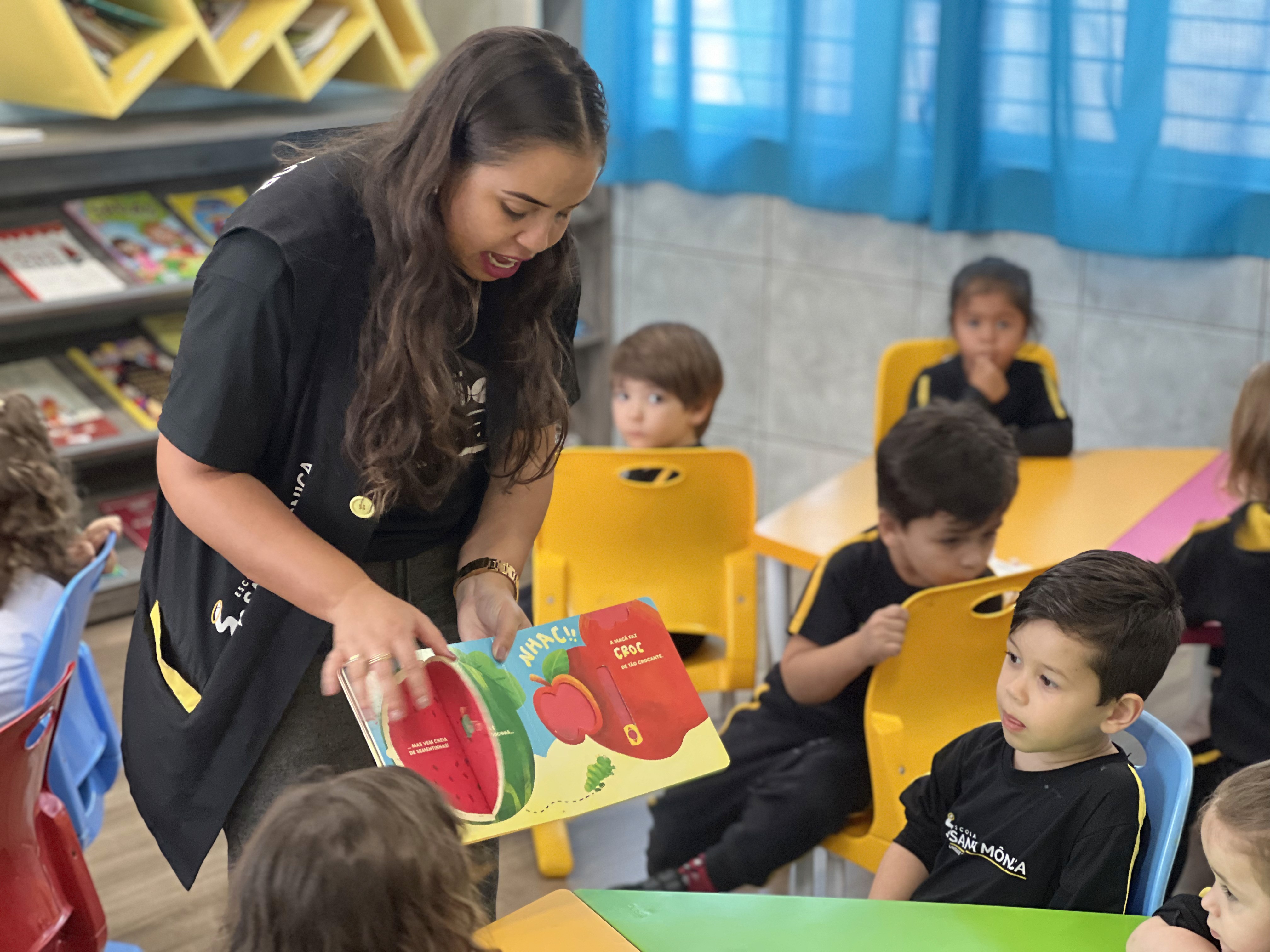 Durante esse momento, a professora conduz a leitura de narrativas selecionadas, mediando a escuta dos alunos e incentivando a observação de personagens, cenários e acontecimentos ao longo da história. Ao acompanhar a leitura, as crianças ampliam o vocabulário e desenvolvem a capacidade de compreender e organizar a linguagem oral.
