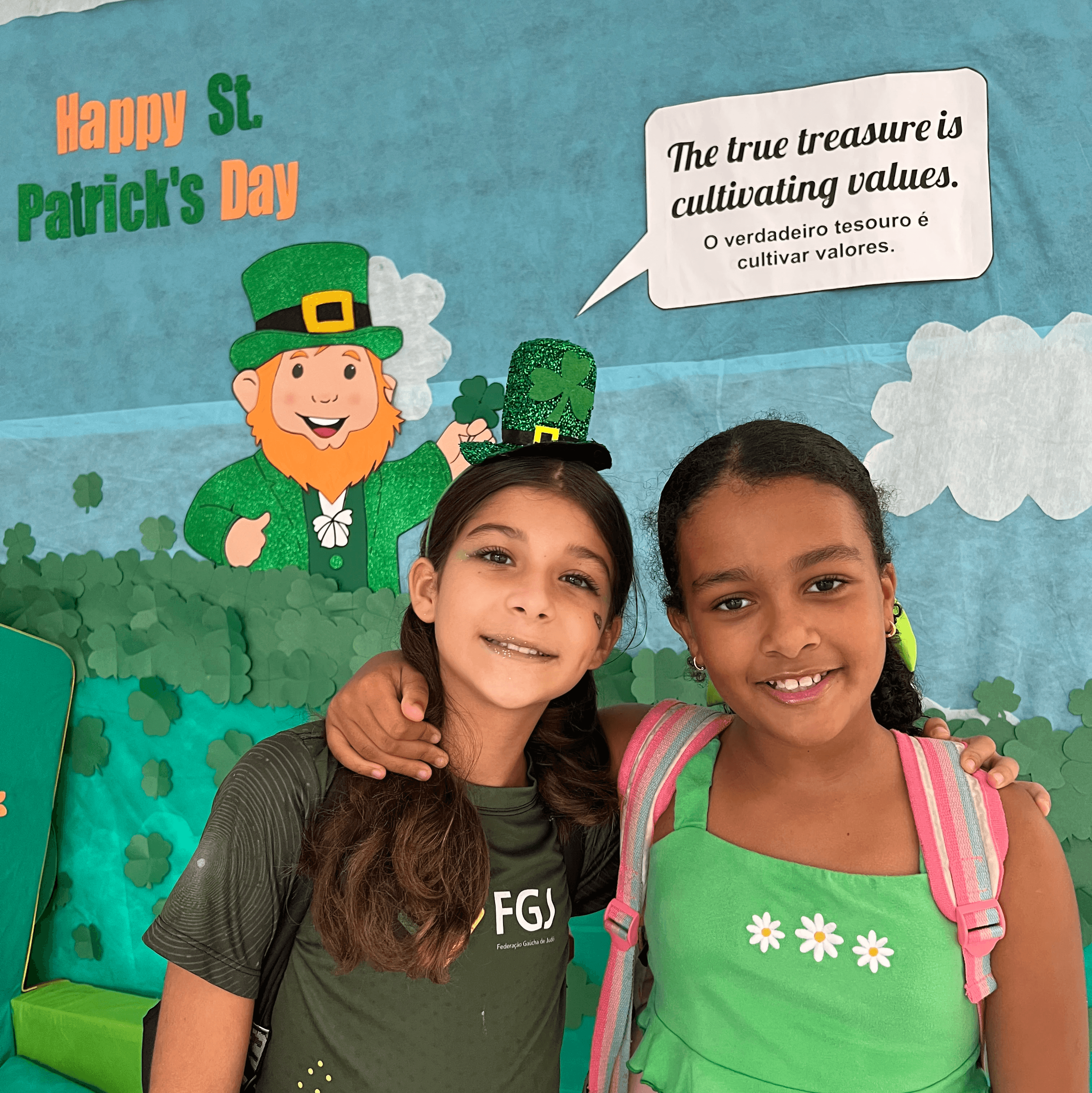 Mais do que aprender uma nova língua, os alunos tiveram a oportunidade de vivenciar a cultura, desenvolvendo habilidades linguísticas enquanto ampliam seu repertório cultural. Como culminância das atividades, todos os alunos participaram, juntos, da construção e contação da história do St. Patrick’s Day, compartilhando aprendizados e experiências entre as turmas. Iniciativas como essa reforçam o compromisso do programa bilíngue em proporcionar experiências de aprendizagem dinâmicas, contextualizadas e inspiradoras.