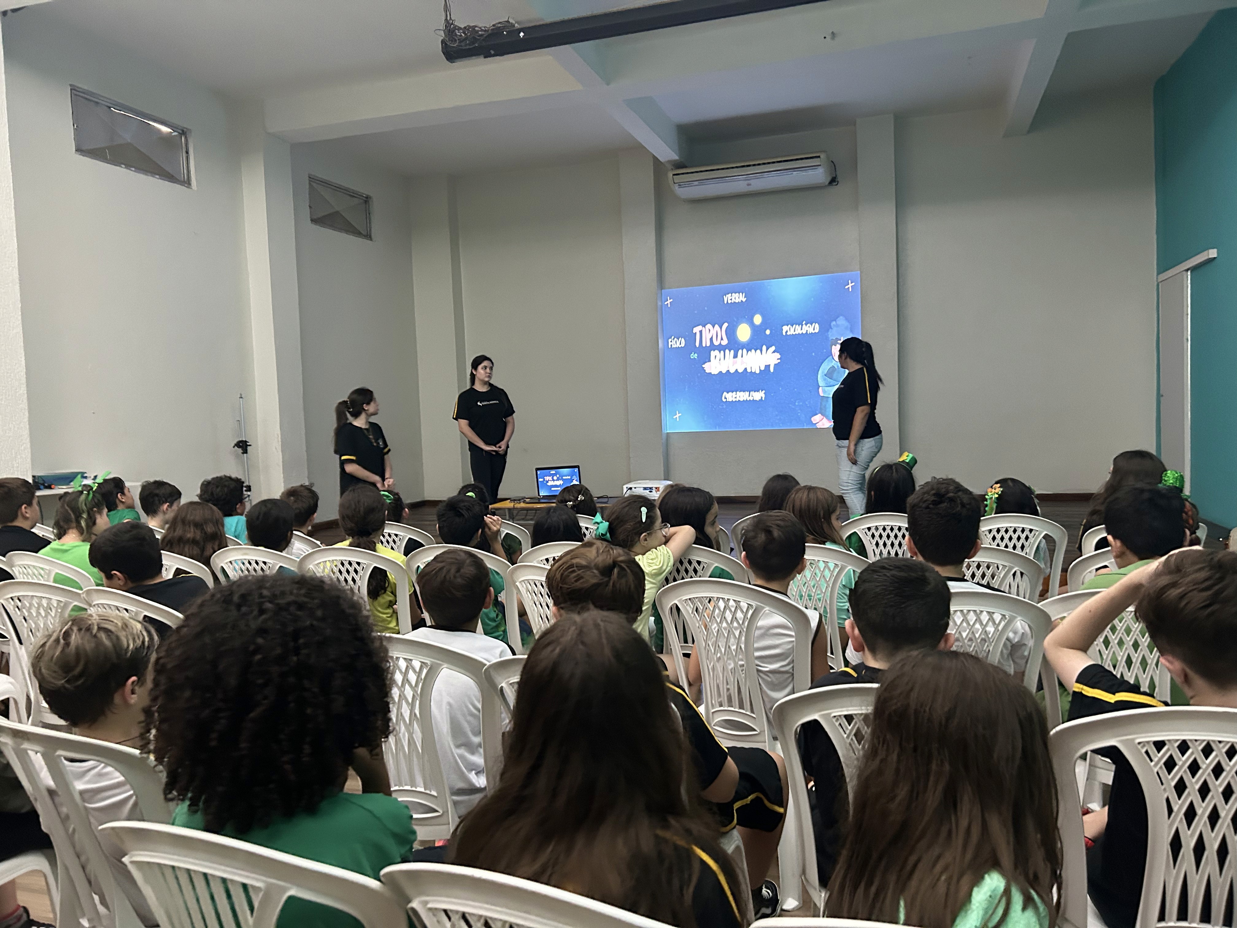 A atividade foi conduzida por alunos do Ensino Médio da escola, que apresentaram uma palestra sobre situações do cotidiano, impactos do bullying e formas de prevenção.
